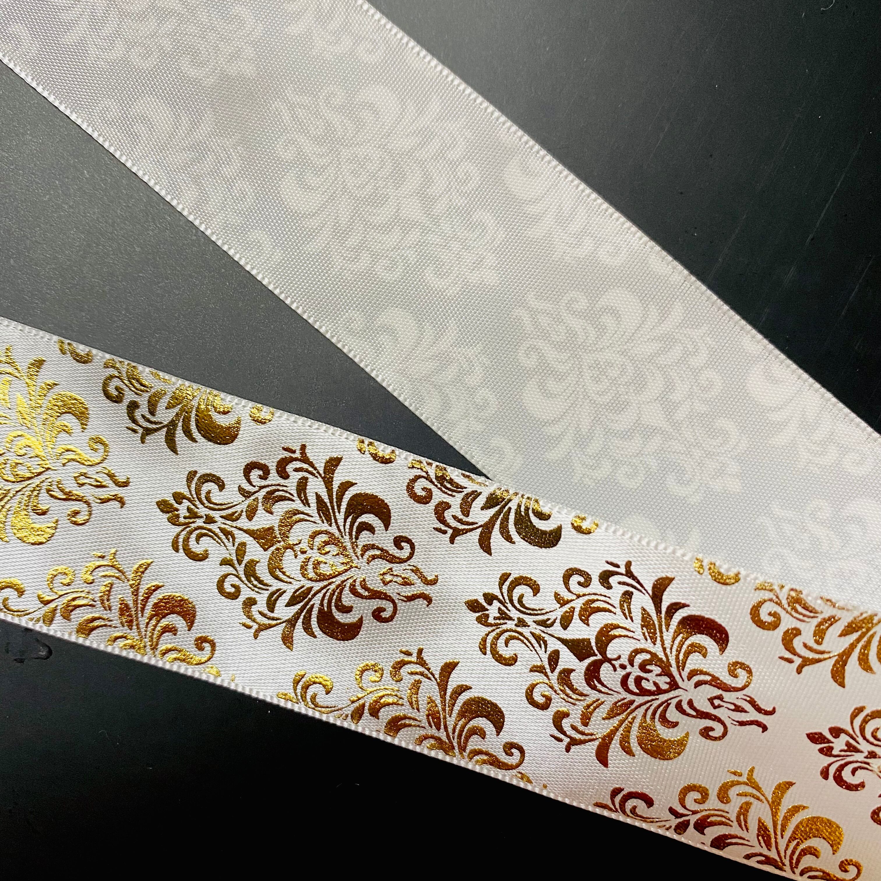 38mm幅 サテン ゴールドダマスク 箔押し リボン 黒 白