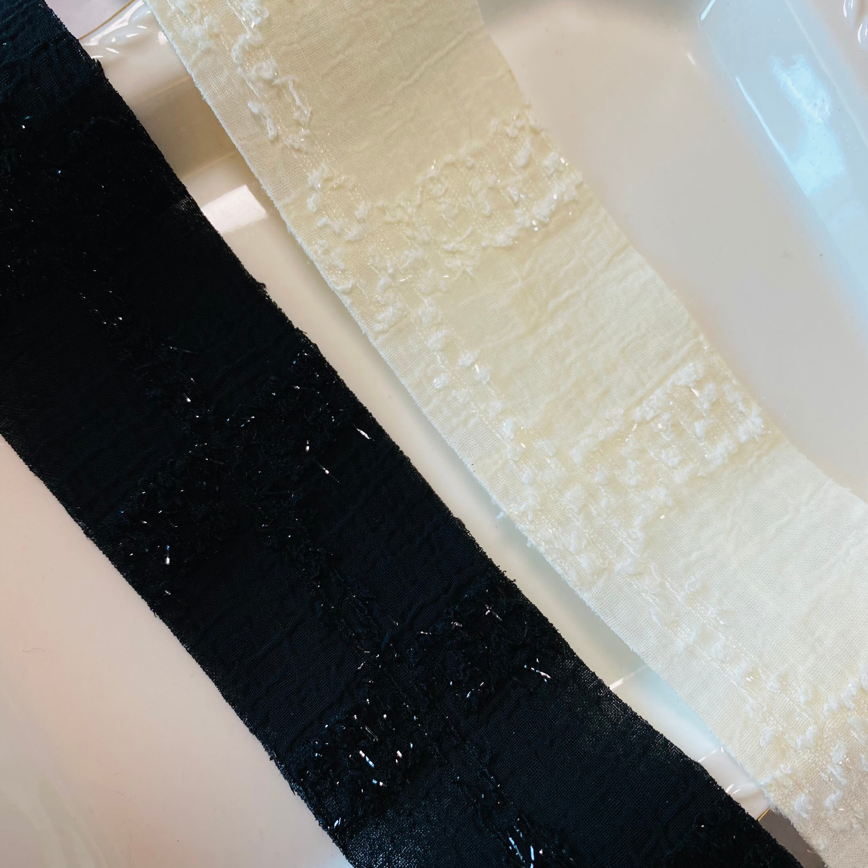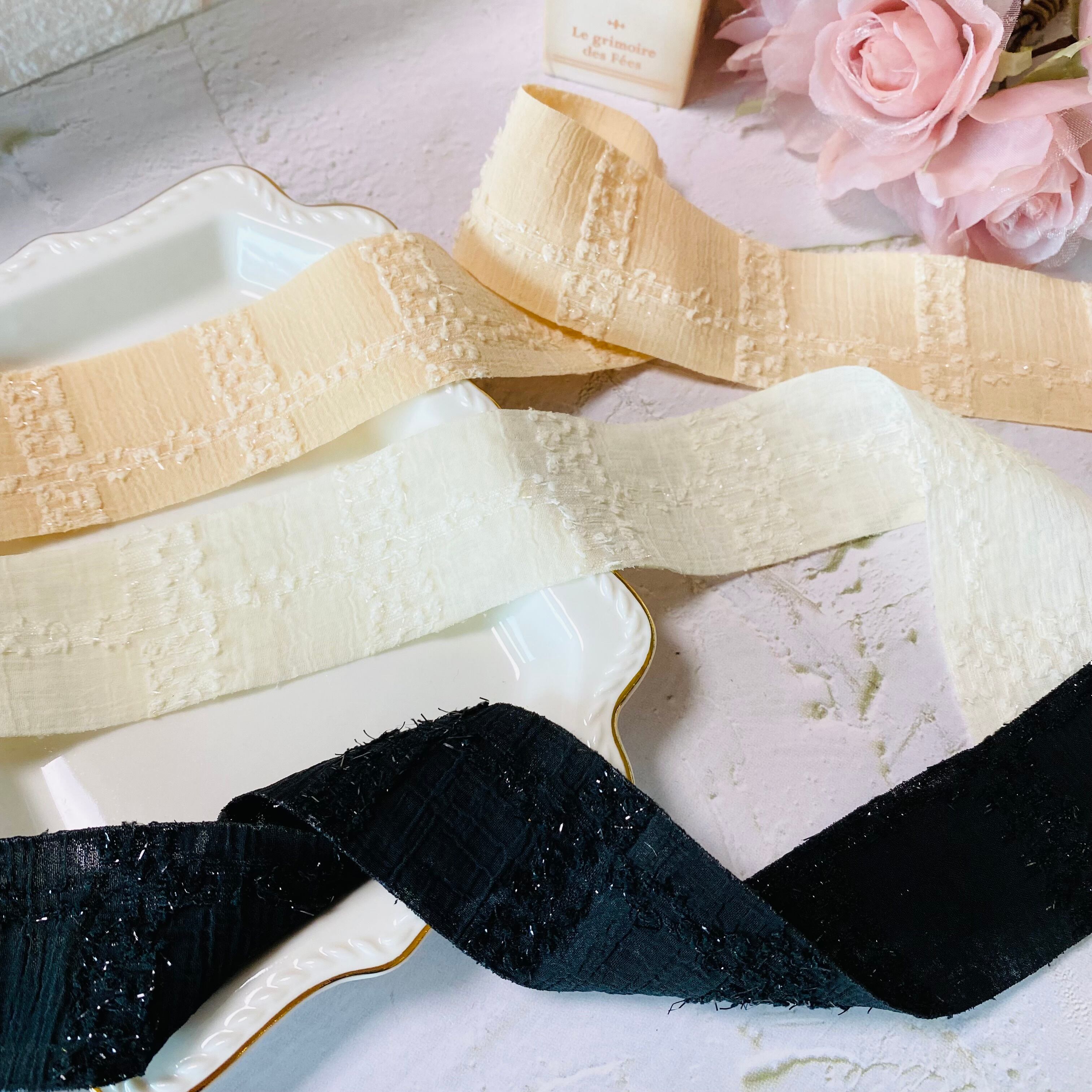 程よい厚み、柔らかさで表面の織りの部分にはキラキラ反射する短いタッセルが織り込まれていてシンプルなリボンですが華やかさがあります♡