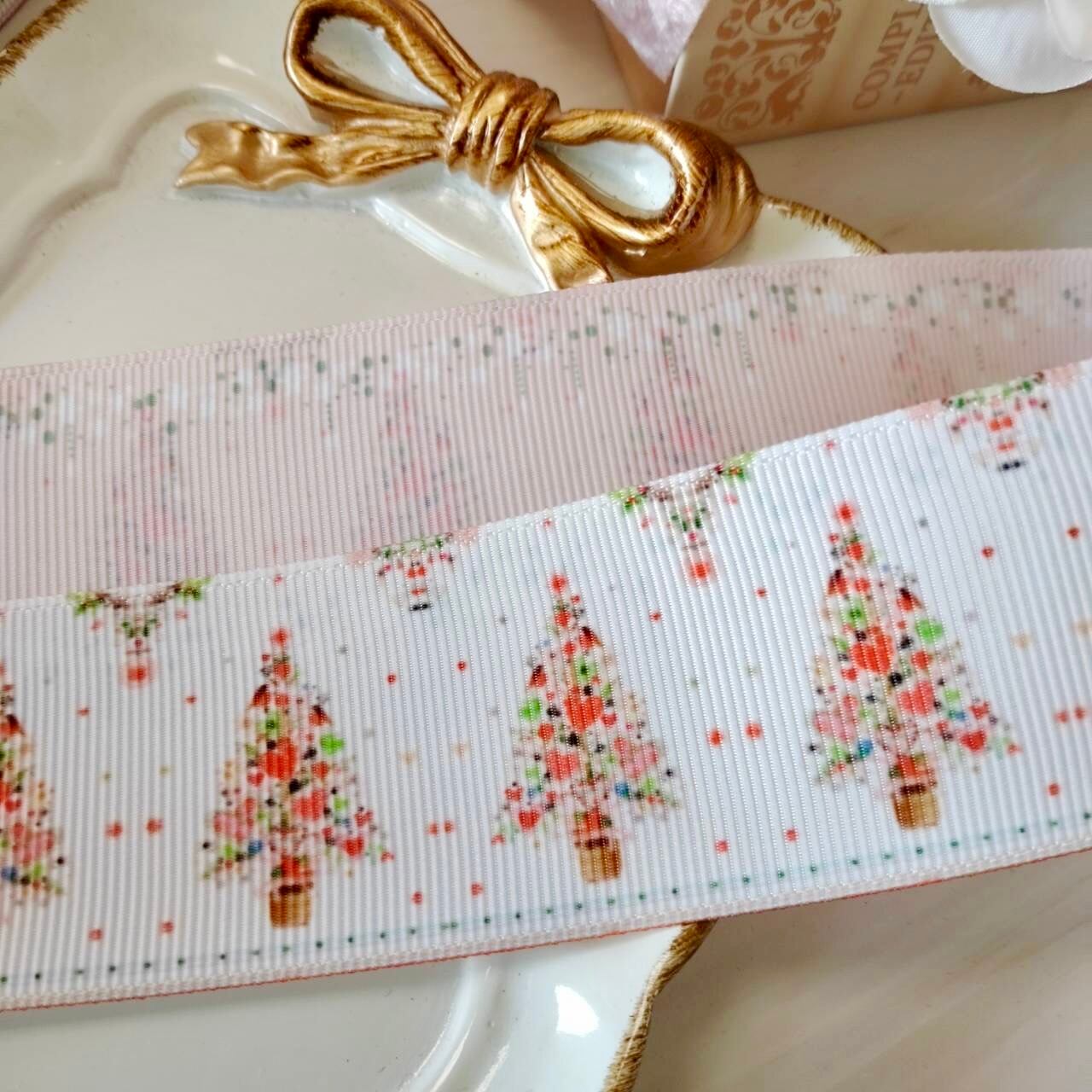 アイボリーベースに小さなハートが散りばめられたふんわりしたカラーのクリスマスツリーリボンです♡