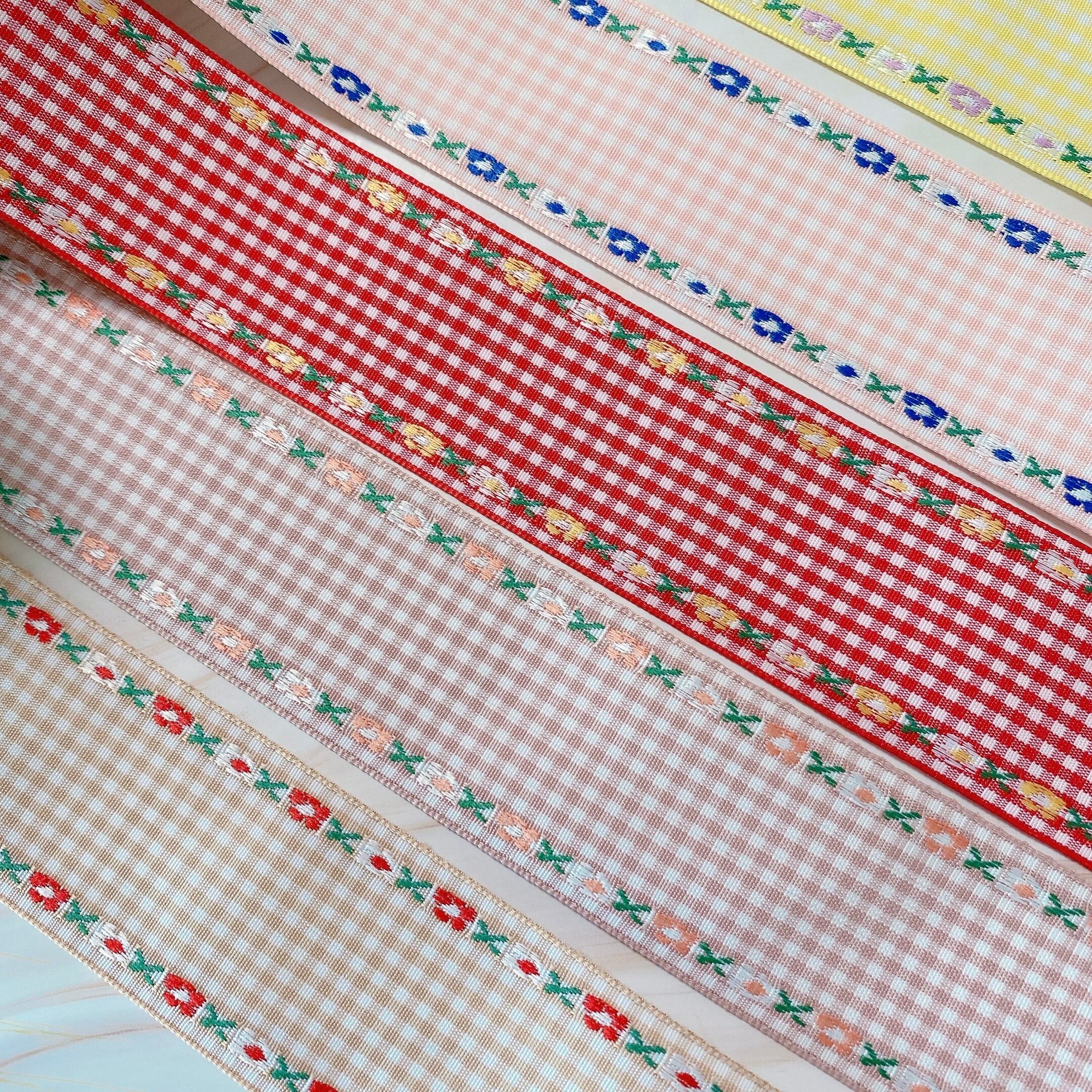 ⭐️3m360円⭐️ 38mm幅 サイド花刺繍 チェック ファブリックリボン ♡高品質♡ 刺繍リボン