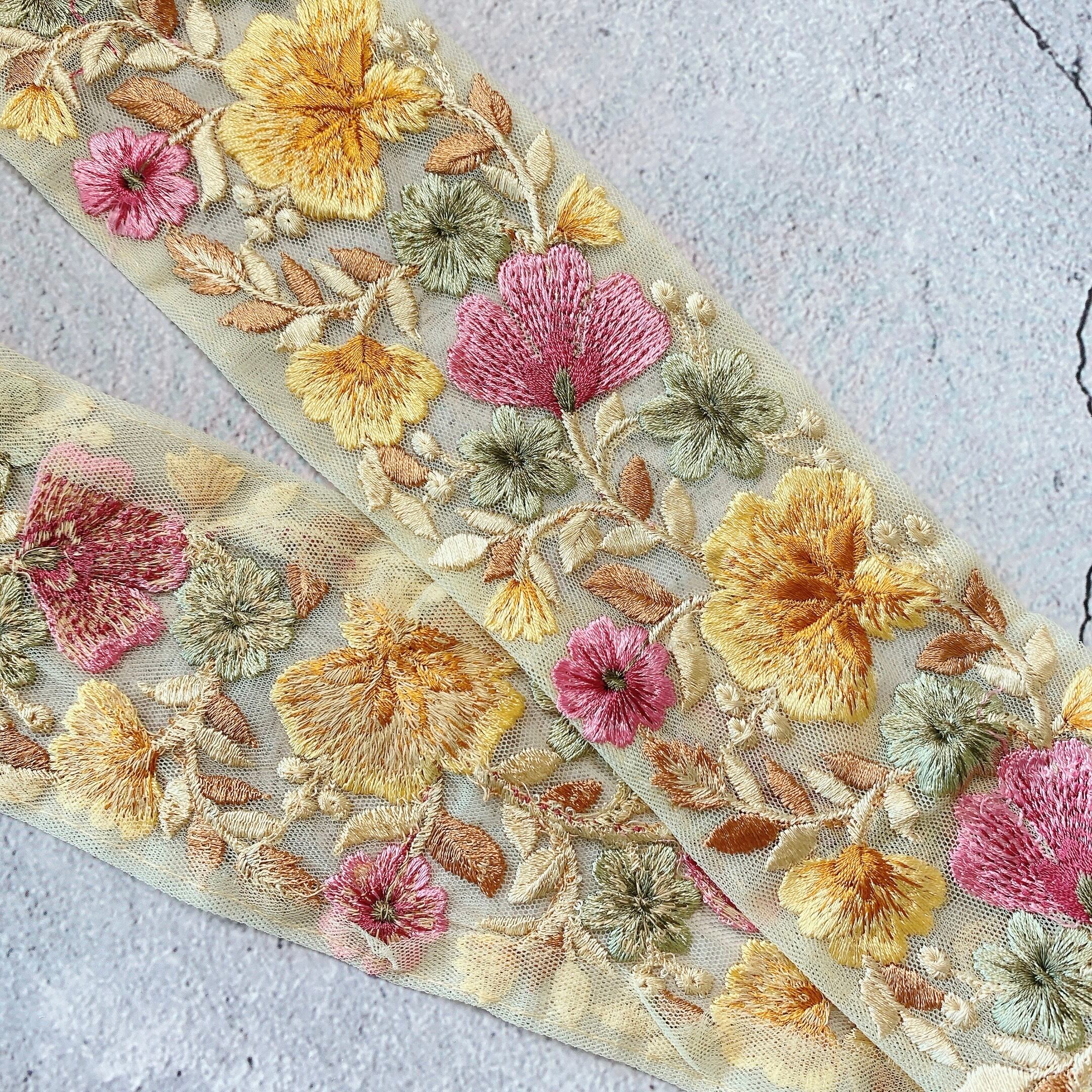 ★50cm単位販売★ 約70mm幅 チュール地 インド刺繍リボン ネム(合歓の花) 花柄