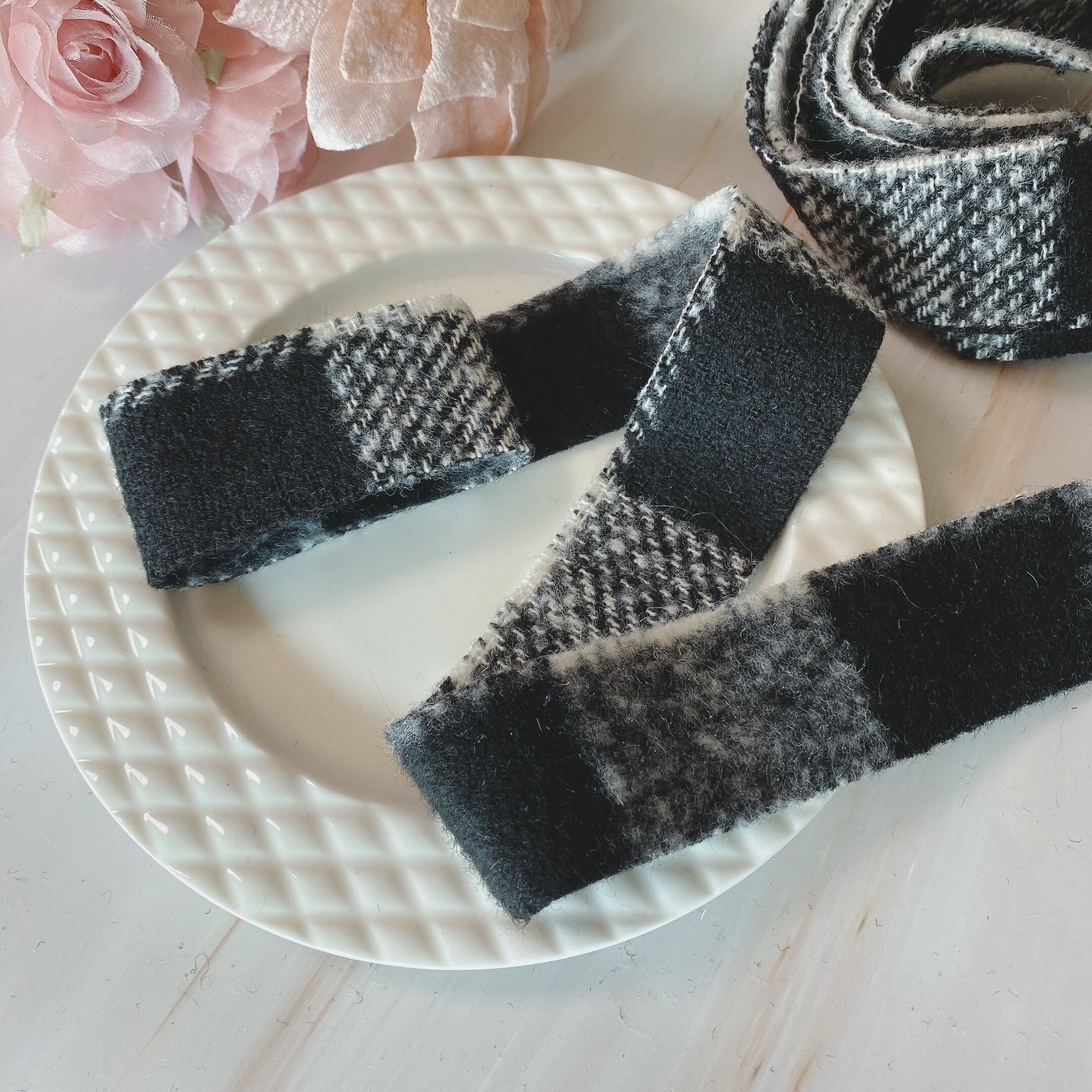 ツートンブロック 38mm幅 チェック風 シャギーニットリボン